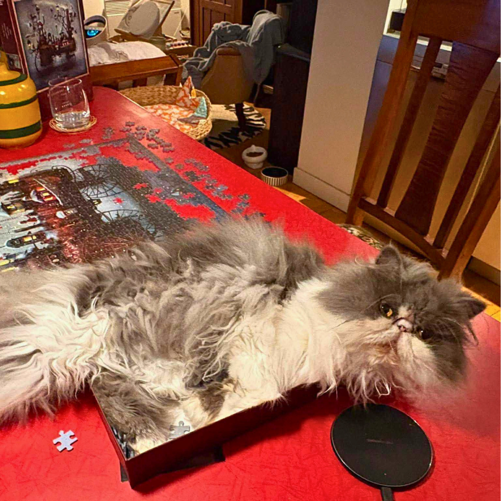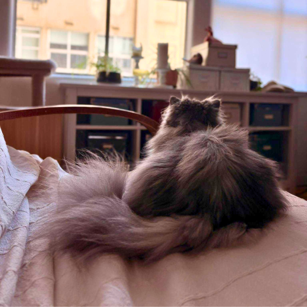 After five months of recovery, decompression, and simply being herself, Wisteria has shown exactly who she is. She is a stocky, pugnacious, irresistibly cute lilac British Shorthair–turned–faux Scottish Fold with an exceptionally sunny disposition. Through polyps, pneumonia, breathing difficulties, a single broken tooth, extensive medications, and her daisy collar, she has remained genuinely happy and good-natured at all times.